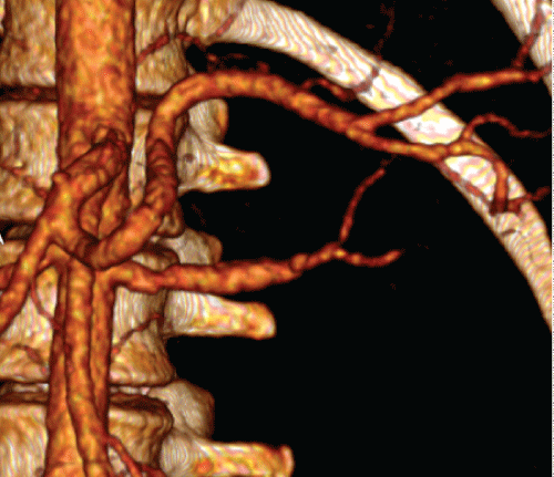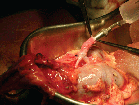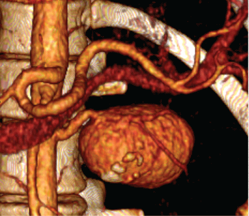 A 32-year-old woman presented with a one-year history of mild abdominal pain in the left upper quadrant and a palpable pulsatile abdominal mass on physical examination. The results of laboratory investigations, including serum urea and ceatinine levels, were unremarkable. Contrast enhanced Computed Tomography (CT) showed a large left renal artery aneurysm, measuring 5,0cm by 3,5cm, but no evidence of renal perfusion alterations or other vascular abnormalities (Figure 1). She had been previously submitted to an unsuccessful lendo vascular approach within tention to treat the aneurysm and preserve left renal perfusion. Because she was young and in good health, our purpose was to preserve left renal function and an open repair was adopted. The patient underwent a laparotomy with midline incision and the left kidney, left renal vein and artery were circumferentially mobilized from surrounding tissues. Left renal vein and artery were clamped and transected while the ureter was left intact and the ex-situ reconstructionwasperformedonthebodywall.Surfacecoolingandhypothermic renal perfusion with Euro-Collins solution (4 oC) was performed. Other authors have suggested that when more than 40 minutes of warm ischemia are required, the same assures to protect renal function should be instituted [1]. The aneurysm was then resected leaving the stump of the distal renal artery. The left hypogastric artery has been previously dissected and was used as autograft for renal artery reconstruction (Figure 2). Hypogastric autografts has been used in larger series and have important role in complex branched renovascular lesions [2]. Left renal vein was primarily and a stomosed and the kidney was returned to the original position. The patient was discharged in six days later, renal function remained unchanged and symptoms resolved. Duplex scan and contrast enhanced CT surveillance demonstrated left renal artery and vein patency (Figure 3).