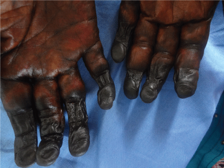 Figure 1A: Symmetric peripheral Gangrene. Cyanosis is seen over the palms along with gangrenous fingers.