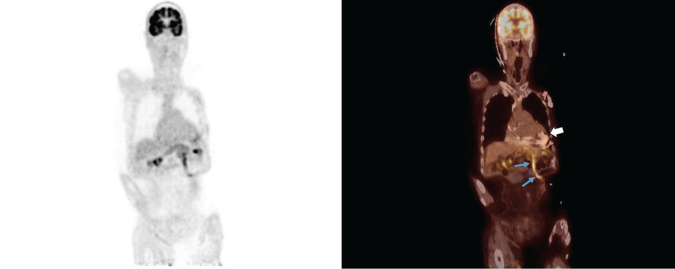 Figure 1: PET/CT demonstrating isolated drive line infection - A 79 year old with non-ischemic cardiomyopathy status post destination therapy with left ventricular assist device, presented multiple times in the year following device placement with hypotension, fever, chills, leukocytosis and abdominal pain. 2D cardiac echo and CT abdomen/pelvis with contrast were performed but no source of infection was identified. After 8 months of treatment failure with escalating intravenous antibiotics, whole body 18FDG-PET/CT demonstrated increased activity diffusely along the drive line (blue arrows). Notice the absence of FDG uptake within or surrounding the main LVAD pump (white arrow) on planar or fused images. These two findings in conjunction are consistent with isolated drive line infection of the LVAD device. There is a high prevalence of device-related infections in LVAD patients [1] with sepsis being the leading complication in this population [2] and accounting for more than twice the number of deaths compared to device failure [3]. Infection typically involves the driveline which connects the LVAD pump to its external power source and can present clinically with fever, chills, leukocytosis, erythema and purulent drainage at the exit site [4]. Less commonly, infection can extend up to the subcutaneous recess where the LVAD pump is housed leading to pump pocket infection, in which case deep tissue tenderness may also be present [5]. Anatomic imaging (CT, Ultrasound) is sensitive in identifying fluid collections, if any, associated with the infection site. However there is evidence that scintigraphy is more sensitive in identifying and localizing infection, especially early on in its course [6]. This case illustrates the utility of physiologic imaging with PET/CT to diagnose and localize LVAD drive line infection even in the setting of persistent negative anatomic imaging and associated rare complication of colonic erosion with the drive line.