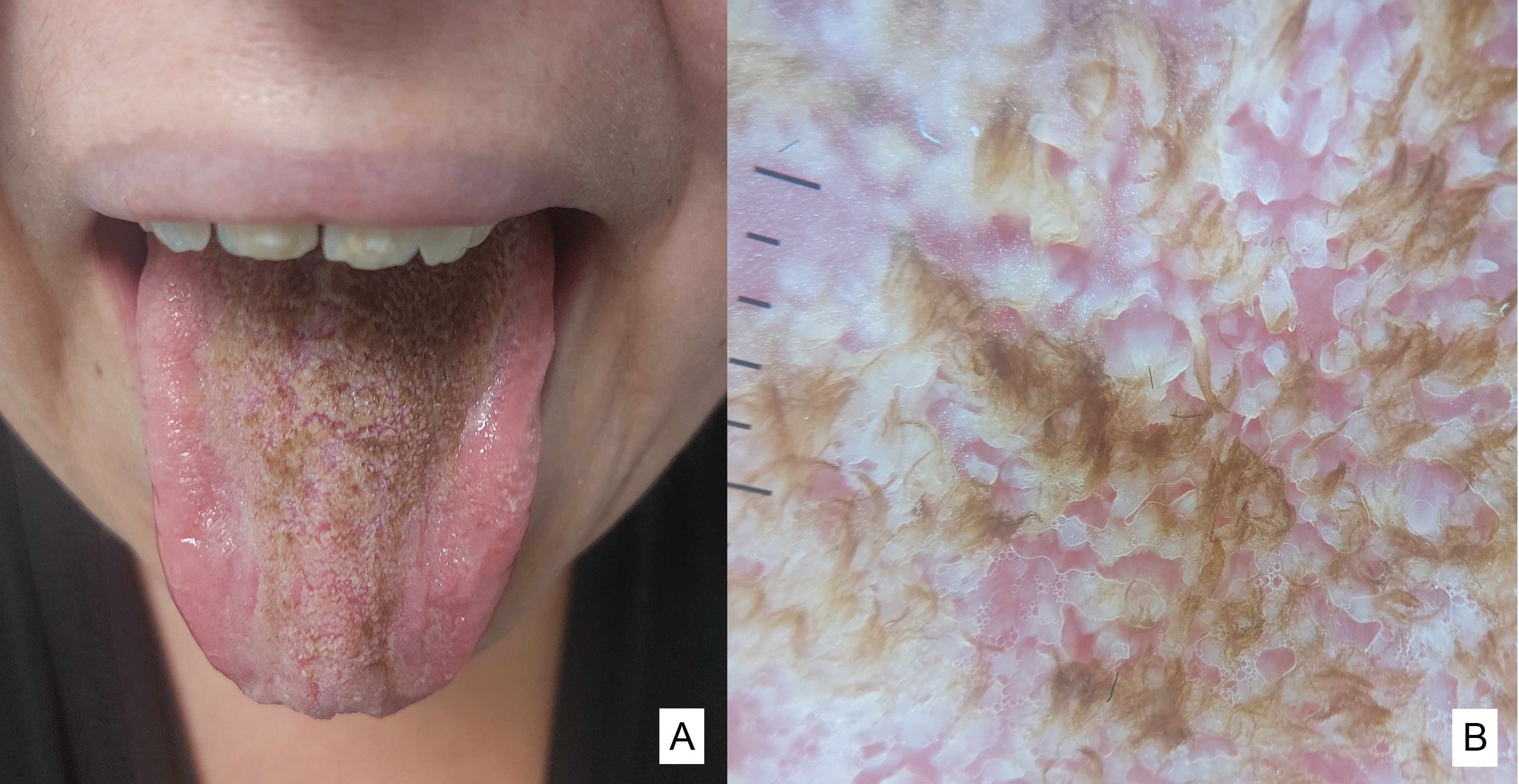 Black hairy tongue is a benign, self-limiting, usually asymptomatic lesion, characterized by the presence of elongated filiform papillae of the dorsum of the tongue. Known risk factors include poor oral hygiene, tobacco, and antibiotics. The pathophysiology remains unknown but a change in microbiome has been suggested. Dermoscopy can aid in the diagnosis of this disorder. As far as the authors are concerned, this is the second article depicting these dermoscopic features.
