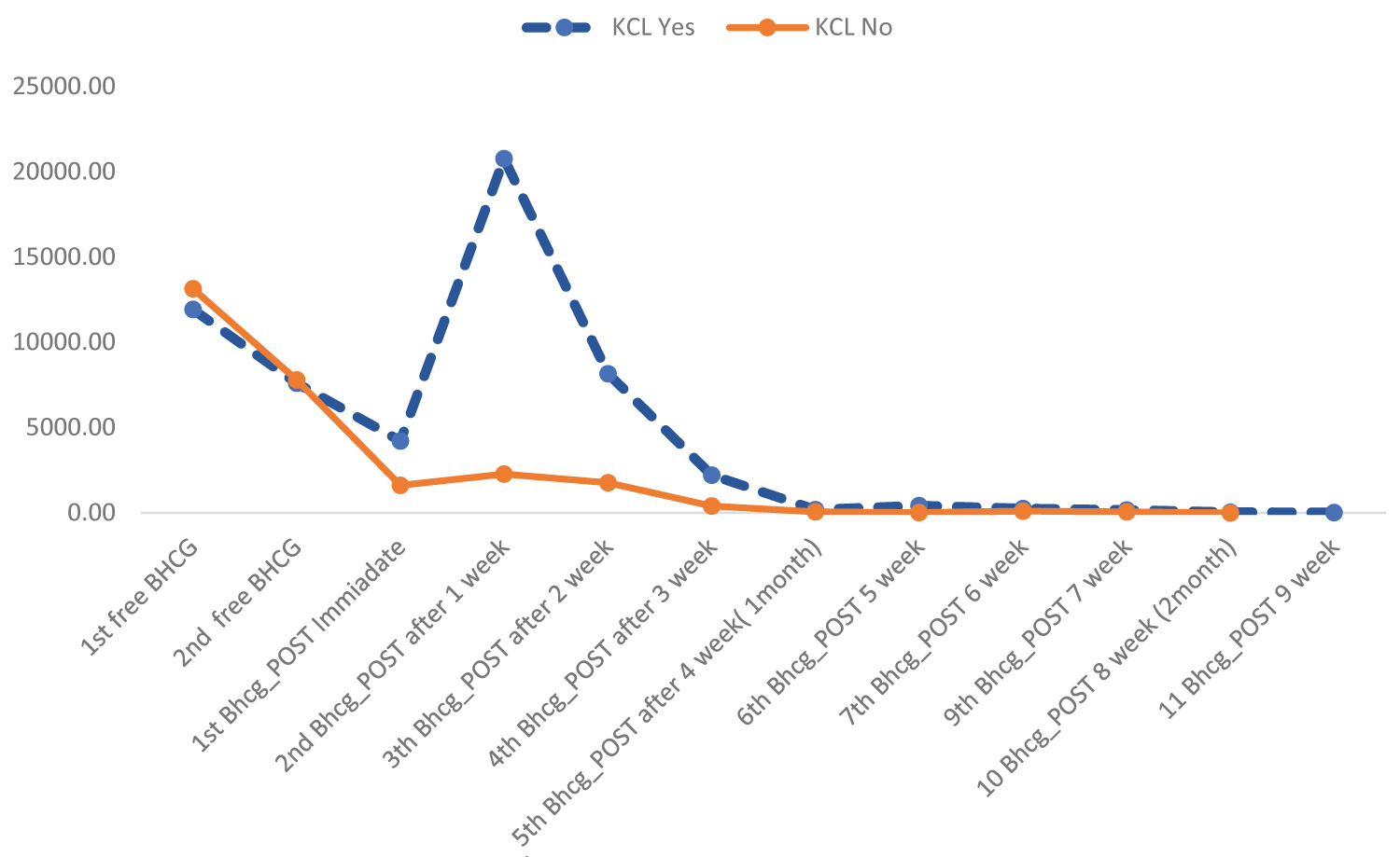 Figure 3: BHCG changes before and after KCL among female patients with ectopic pregnancy among patients received KCL and others.