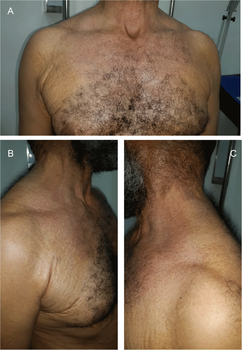 Figure 1(a,b,c): Yellowish papules on the anterior and posterior trunk predominant at the level of the folds with a retractile, thickened and pseudosclerotic aspect of the skin, the inhomogeneous color of the papules at the level of the trunk gives an appearance of poikiloderma.