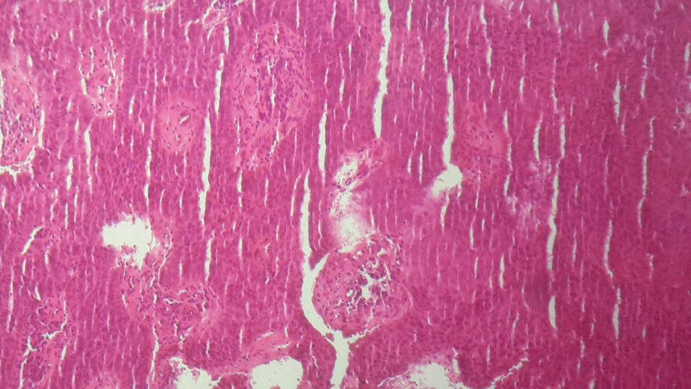 A 74-year-old man, with no notable pathological history, especially without condyloma or toxic exposure. Consulted for an ulcerated tumor of the ventrolateral side of the penis, of 5 centimeters in diameter, evolving for eight months, resistant to symptomatic treatments, bleeding on contact with an early scrotal infiltration and without inguinal lymphadenopathy or urinary signs (Figure 1). The cutaneous biopsy showed an epithelial tumor proliferation, arranged in masses and in casings made of polyhedral cells possessing a cellular framework, a cytoplasm of average abundance, basophilic and provided with a hyperchromatic ovoid nucleus and of variable size, the Mitotic figures are numerous, the stroma reaction is of fibroinflammatory type (Figure 2). The diagnosis of a moderately differentiated infiltrative and non-keratinizing epidermal carcinoma was retained. The locoregional and general extension assessment was reassuring and the patient was referred to an urology departement for additional care.
