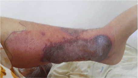 A 43-year-old woman, with history of breast cancer under hormone therapy by Tamoxifen for three years, consulted for bullous hemorrhagic and necrotic erysipelas in the left leg, lasting for a week in a context of fever and poor general condition (Figures 1 and Figure 2).
