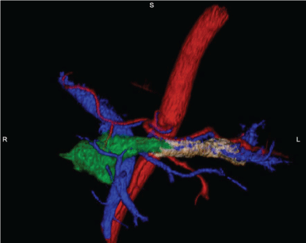 Pancreas on image shows tumor on the right hand side in green (Figure 1). Showing to go into the blood vessels. This would be in the later stages of the cancer where the patient will likely to have low chance of survival if surgery and therapeutic treatments were not taken into consideration. Therapeutically, this will increase the chance of survival. To diagnose the patients' pancreas, multiphase CT scanning is required to be able to penetrate through to the skin and tissue towards the pancreas since it is so well placed within the other organs. Additionally 3D imaging also playing vital role for additional info for the purpose of Diagnostic, Surgical and Therapeutic purpose. It is going to be the Future of Radiology which can be helpful for the early detection of pancreatic cancer.