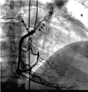 A 42-years-old-male patient presented sudden dyspnoea and was diagnosed with acute PE, and started treatment with warfarin. Despite the treatment, the dyspnoea worsened over the years. He was then referred to our pulmonary hypertension center. On admission, he presented functional class III, pulse oximetry of 90%, severe lower limbs edema. At echocardiography, systolic pulmonary artery pressure was 112 mmHg, with signs of severe right ventricle dysfunction. CT scan demonstrated signs of CTEPH associated with marked bronchial arteries dilation (Figure 1). The right heart catheterization showed mean PAP 60 mmHg, PVR 12.9 W, CO 3.8 L/min. Coronary angiography demonstrated collaterals between the right coronary artery and bronchial circulation (Figure 2). These appeared to contribute to myocardial ischemia, evidenced by a myocardial nuclear scan.