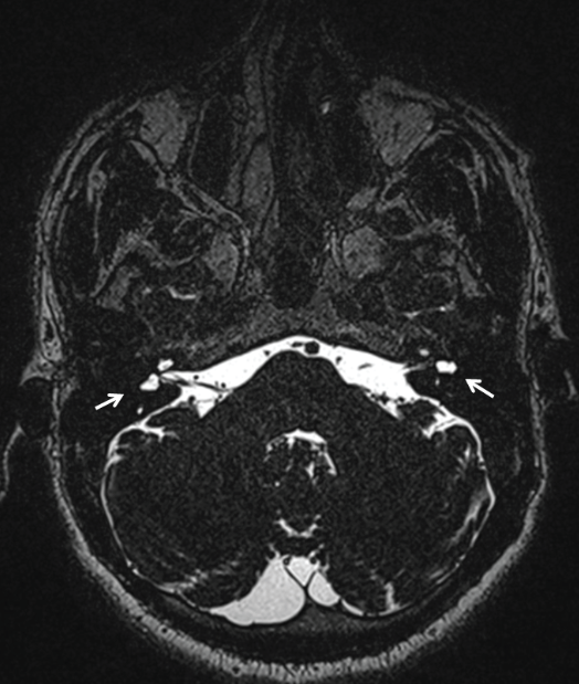 Figure 1: Axial CISS image shows bilateral isolated aplasia of the lateral semicircular canals (white arrows).