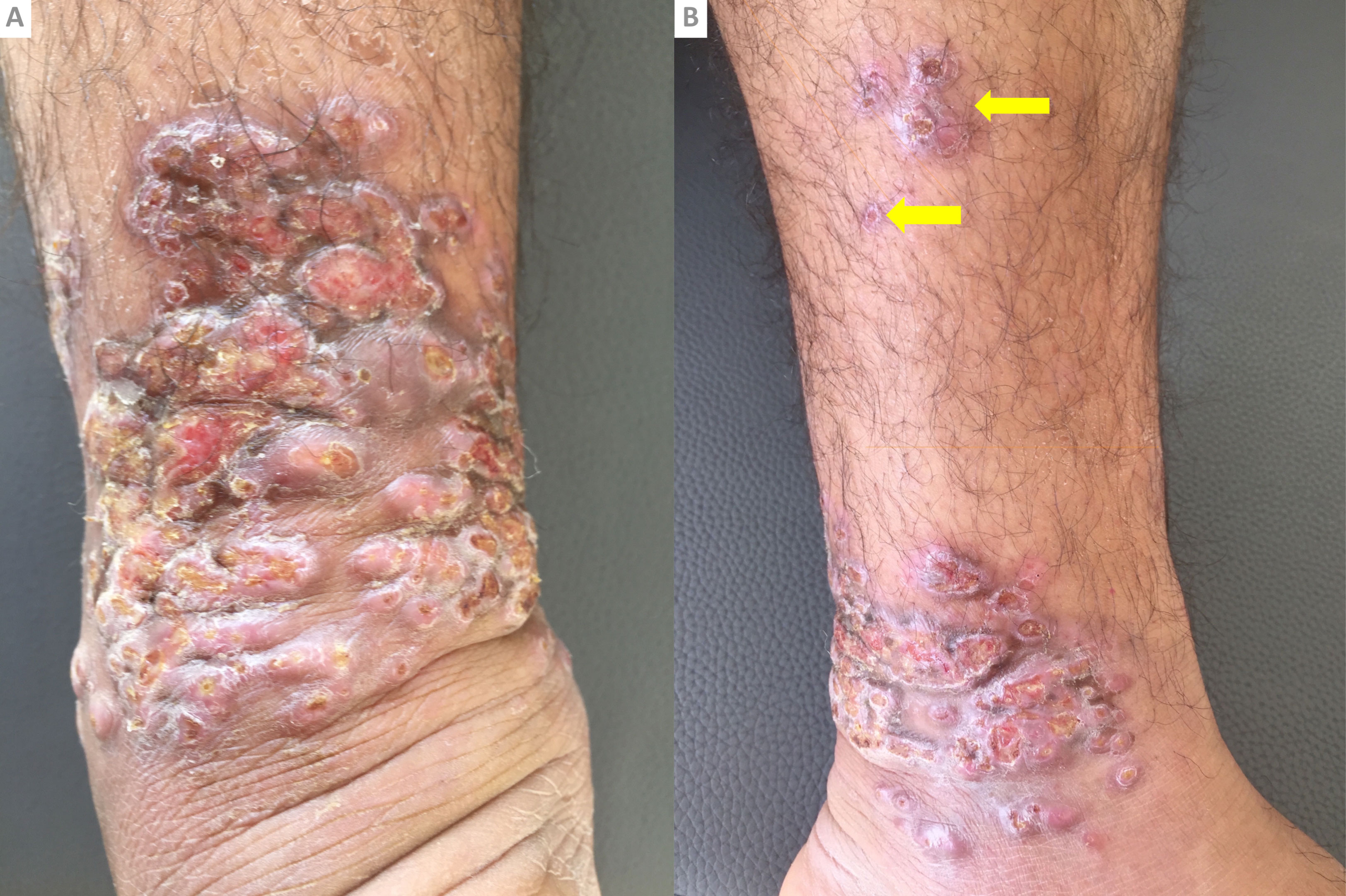 A 39-year-old patient, who travels 2 years ago to a desert area in south-eastern Morocco, presented with an ulcerous and crusty plaque on his left leg. The clinical exam founds numerous, ulcerous and crusty nodules, confluent to form a plaque of about 5 cm long (Figure 1A), painless with some smaller satellite lesions (arrows) arranged on sporotrichoïd pattern (Figure 1B). Parasitological examination found numerous amastigotes within mononuclear cells and pathology shows a granulomatous infiltrate thus establishing the diagnosis of leishmaniasis. Leishmaniasis is a parasitic disease due to a flagellated protozoan belonging to the genera Leishmania, transmitted by female sandflies from the genera Phlebotomus in the "Old World". The sporotrichoïd pattern is explained by the lymphatic spreading of the infection and always requires systemic treatment like our patient, whom been treated with intramuscular injections of meglumine antimoniate with complete healing of the lesions 12 weeks after [1,2].