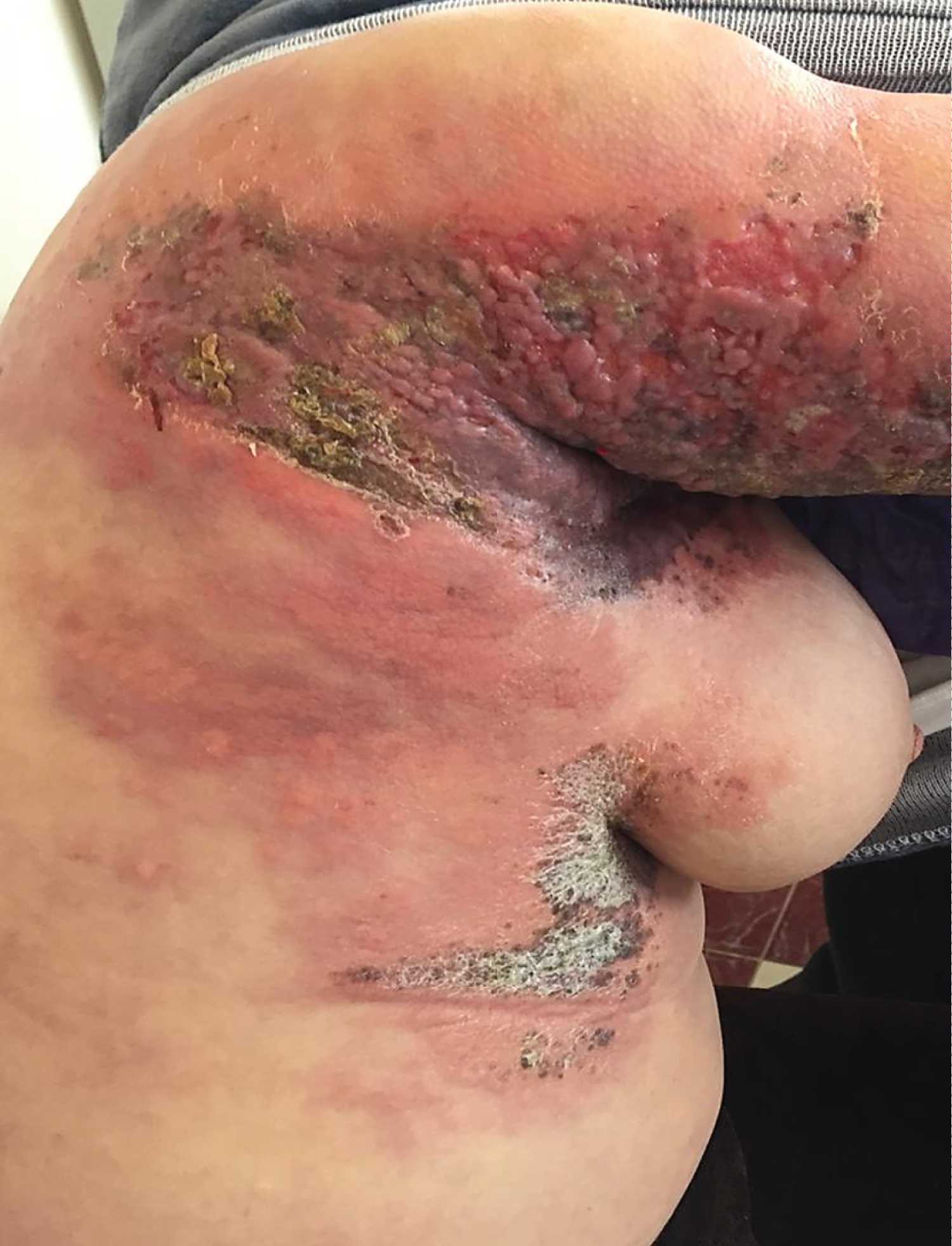 Figure 1: Polymorphic lesions: ulcerous, keratotic and necrotic areas.