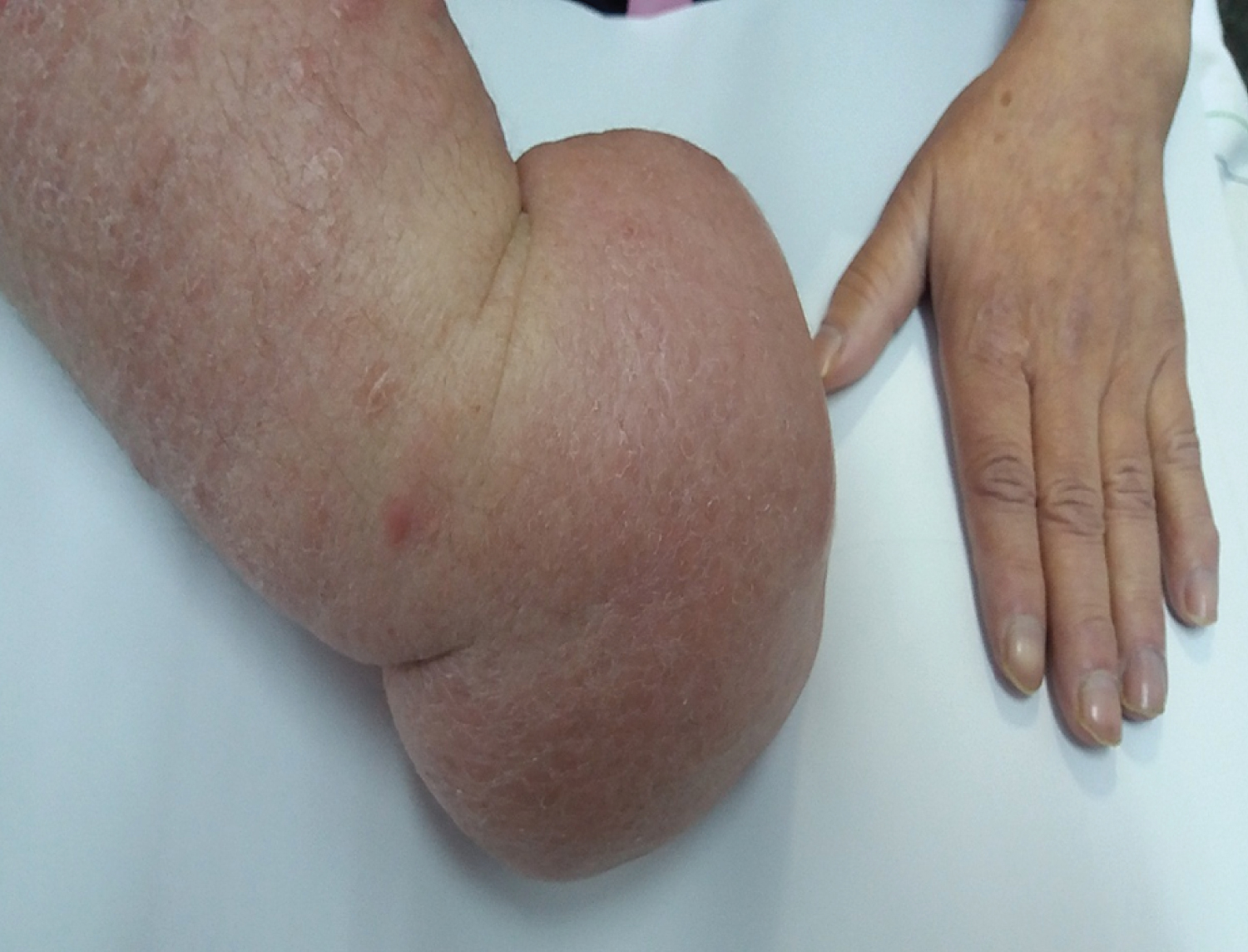 This is a 42-year-old woman, living in the countryside and without any particular antecedents, who presented 8 months before her admission a swelling of the right upper limb. She was treated several times as a bacterial hypodermatitis but without any favorable response. The symptomatology has recently been aggravated by the appearance of keratosisand necrotic plaques with extension of the edema to the right half of chest. On general examination, the patient was cachectic with respiratory dyspnea. Dermatological examination found an erythematosus, infiltrated and sclerotic plaque spread over the entire right chest and the right arm andulcerating and necrotic areas (Figure 1). Lymphedema was very important, extending up to the arm, forearm and hand (Figure 2). Examination of the right axillary lymph node area was difficult. Breast examination showed a nodule sitting in the inferior-internal lobe of the right breast, not well limited, with sclerotic and red skin in regard. A skin biopsy performed at the periphery of an ulcerating areas was in favor of a cutaneous localization of an invasive breast carcinoma with presence of lymphatic vascular emboli. Trans-cutaneous biopsy of the breast nodule confirmed invasive breast adenocarcinoma with an immune histochemical study showing a positivity for cytokeratin 7 (CK7+) and a negativity for cytokeratin 20 (CK20-). Hormone receptors were negative. The extension assessment showed a right pleural effusion with secondary lytic bone lesions. Chemotherapy has been recommended for our patient, but her condition deteriorated and she died in the month following.
