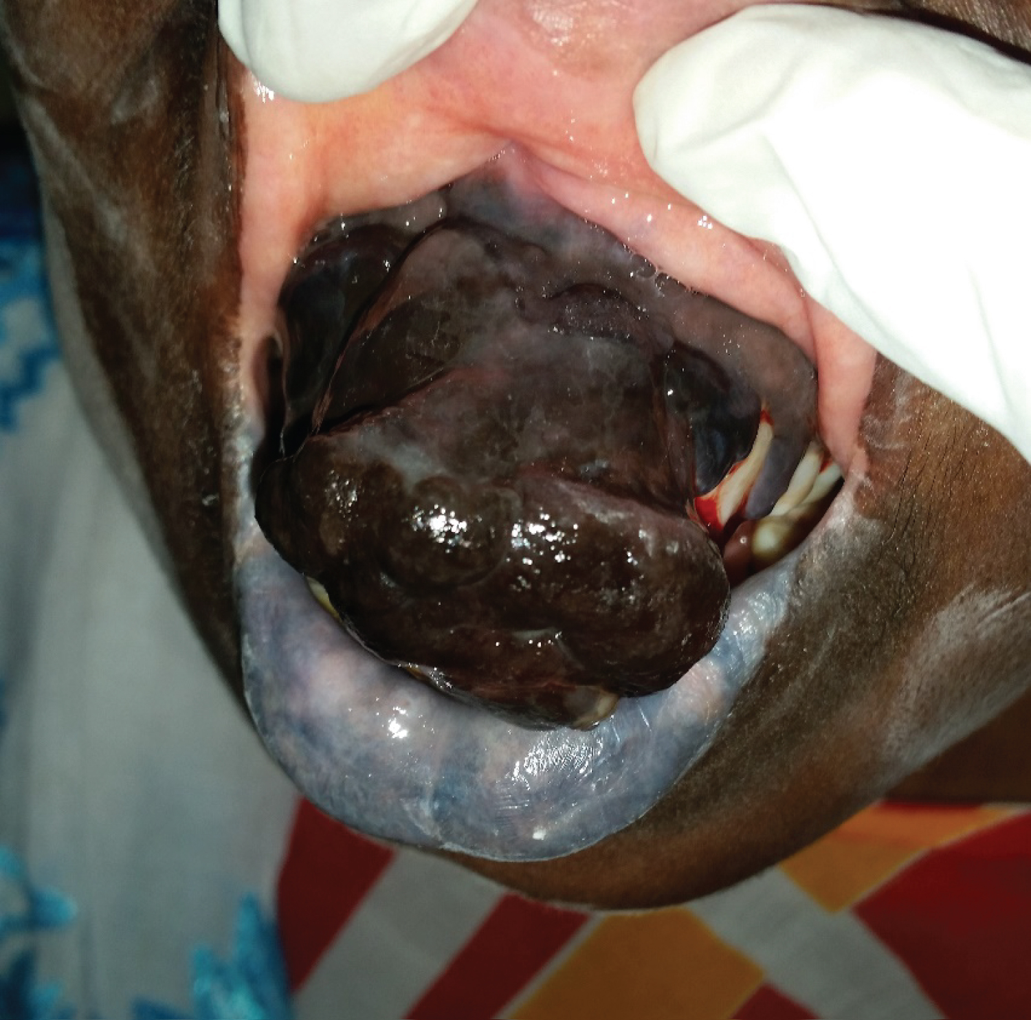 A 57-year-old Senegalese woman consulted to us for a pigmented mass inside the oral cavity evolving since 10 months. She had history of repetitive traditional tattoousing thorns on the gingiva. Intraoral examination showed a large pigmented tumour extending from the right maxillary gingiva to the left maxillary gingiva. It was 7 × 4 cm in size, firm in consistency with slight bleeding on touch. The patient also presented sub-mandibular lymphadenopathies and significant weight loss. An incisional biopsy with histopathological examination confirmed the clinical diagnosis of malignant melanoma. Biological examinations revealed anaemia at 6.9 g/dl and hypoalbuminemia at 23 g/l. HIV serology was negative. The patient dies after 2 weeks prior to any therapeutic perspective.