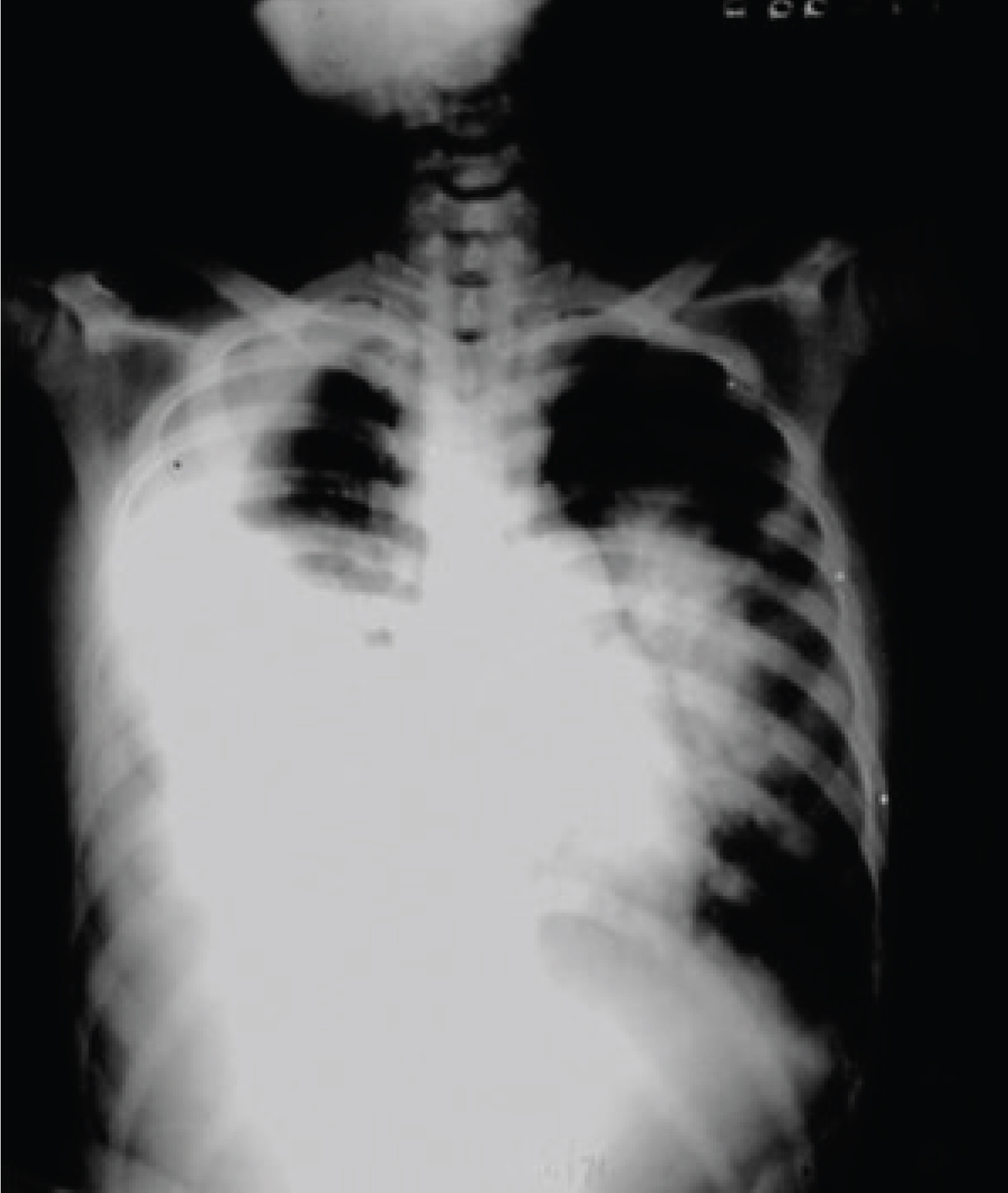The patient’s admitting chest X-ray showed a large right-sided pleural effusion and an infiltrate involving the right lower lobe (Figure 1). Gram stains of her sputum and pleural fluid revealed numerous neutrophils and slender Gram-negative rods. She was placed on intravenous clindamycin at a dose of 30 mg/kg/24 hours. Shortly after admission her condition suddenly worsened when, while lying on her left side, she aspirated the contents of a large and unsuspected right lung abscess into her left lower lobe (Figure 2). Her condition gradually improved with intensive respiratory therapy including tracheal suctioning and continuous positive airway pressure oxygen administration.