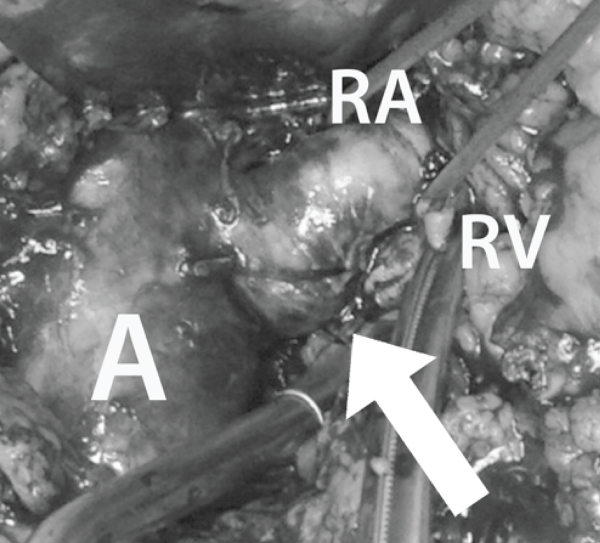 Figure 2: Leaking mycotic aneurysm (arrows) of native renal artery origin; A: Aorta; RA: Renal Artery; RV: Renal Vein (transsected).