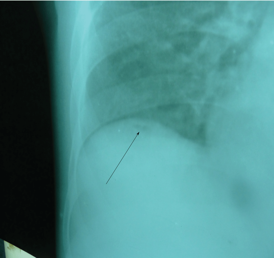 Figure 2: The right side of the chest X-ray showing small air bubble (arrow) below the right hemidiaphragm.