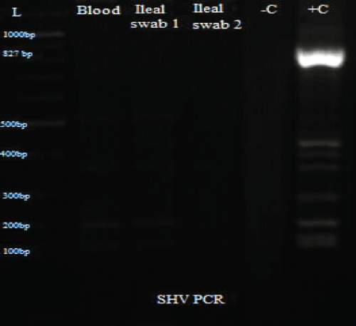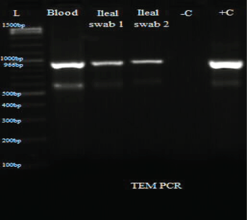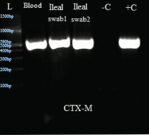 Total DNA was extracted from the swab and blood isolates using Spherolyse DNA extraction kit (Hain Life science GmbH, Germany), following the manufacturer's instructions. The extracts were subjected to single plex conventional PCR analysis targeting the blaSHV-, blaTEM- and blaCTX-M-encoding genes. Fifty(50- μl) reaction mixes consisted of 5 μl of 10X reaction buffer, 4 μl of 25 mM MgCl2, 1 μl of 10 mM dNTPs, 1 μl of forward primer, 1 μl of reverse primer, 0.25 μl of 5 units Taq DNA polymerase and 5 μl of DNA template. The final concentration of each primer was 0.2 μM. Amplifications were carried out with the following thermal cycling profile: initial denaturation for 3 mins at 94 °C, followed by 35 cycles of amplification consisting of 94 μC for 45 s, annealing at 56 μC for 35 s and primer extension at 72 μC for 30 s. A final extension cycle at 72 μC for 10 mins with a holding step at 4 μC was included to finish the entire PCR amplification. In the case of CTX-M, an annealing temperature of 62 μC for 45 s was used. Primers sequences are shown in table 1. PCR results showed the three bacterial isolates were positive for TEM and CTX-M (Figure 3, Figure 4 and Figure 5).