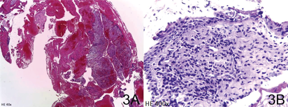 Figure 3: (A) Histopathological analysis of case 1; (B) Histopathological analysis of case 2; both cases showed a predominant presence of acute inflammatory cells. View Figure 3