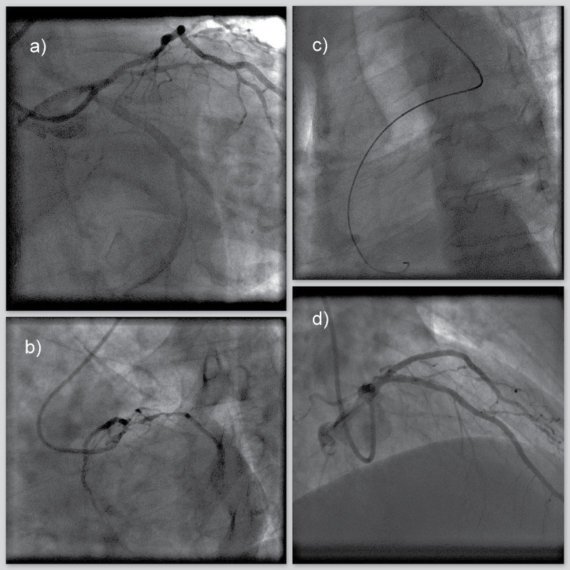 67-year-old man with history of arterial hypertension and type 2 diabetes mellitus was admitted to hospital due to elective coronary angiography. Six weeks before he was admitted due to acute ST elevation myocardial infarction (STEMI) of inferior wall. Coronary angiography, using left transradial access, revealed occlusion of proximal right coronary artery (RCA) and primary PCI with implantation of two drug-eluting stents (DES) was done. Coronary angiography also revealed significant bifurcation stenosis in proximal LAD and ostial first diagonal branch (D1) (Medina 1,0,1) [9] whereas left circumflex artery (LCx) had no stenosis (Figure 1a and Figure 1b). During procedure right transradial access was used due to pathological Allen's test on the left arm as well as weaker pulses bilaterally in the groins.