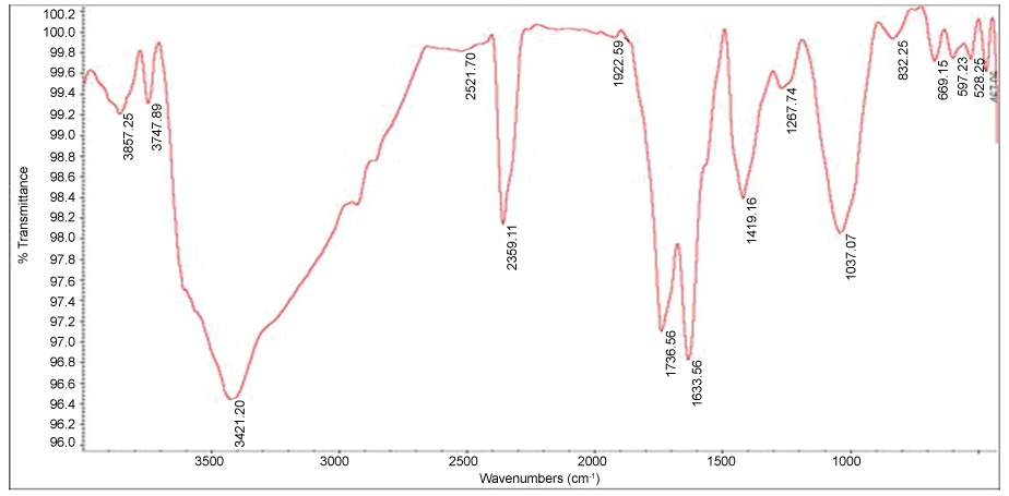 Figure 3 depicts the FT-IR spectrum of GO. Fourier Transform Infrared (FT-IR) spectroscopy was used to detect chemical composition assignment (cm-1): C = O (carbonyl/carboxy) groups at 1736.56; C = C (aromatics) at 1633.56; C-O (carboxy) at 1419.16; (epoxy) C-O group at 1267.74; C-O (alkoxy) at 1037.07 [54,55].