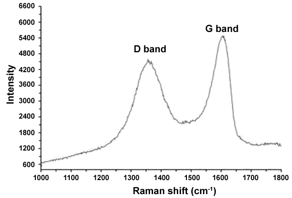 Furthermore, Figure 4 illustrates the Raman spectum of GO includes D and G peaks where the D peak at ~1350 (cm-1) is the result of defects in the Graphene sheets and the G peak at ~1600 (cm-1) is the result of bond stretching of sp2 hybridized Carbons, respectively [56,57].