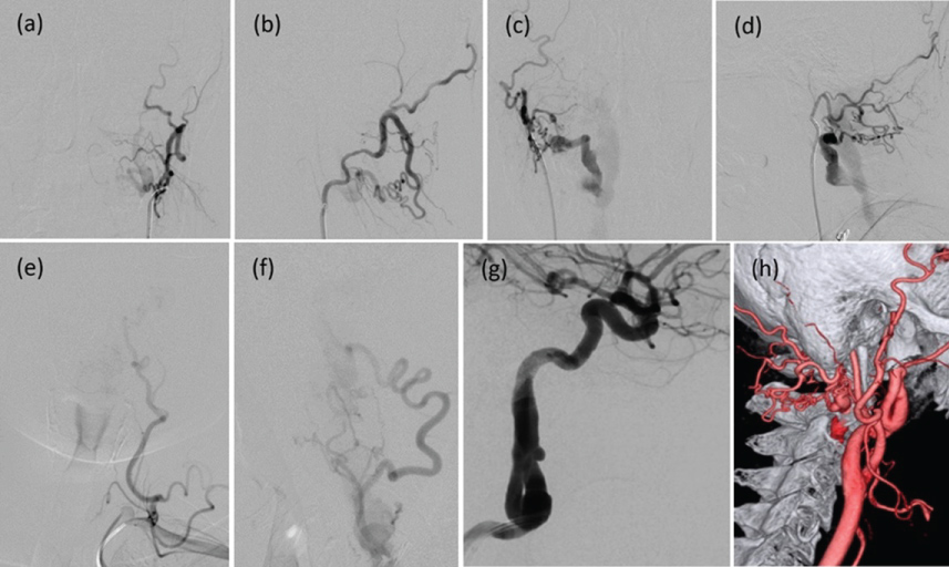 Figure 3: Anteroposterior (a, c) and lateral (b, d) views of the left and right occipital arteries injections, respectively, show reconstitution of bilateral vertebral arteries (VAs). Anteroposterior (e) and lateral (f) views of the left ascending cervical artery injection also reveal reconstitution of the left VA. Lateral views (g) and 3D reconstruction (h) of the right internal carotid artery (ICA) injection demonstrate short segment fenestration or duplication of the cervical ICA combined with a small pseudoaneurysm at the distal end of the fenestrated segment. View Figure 3