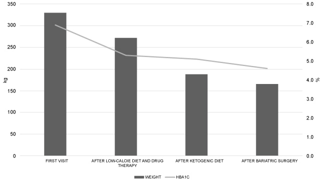 Over the course of a year, with regular monthly consultations, the patient lost 57.8 kg, with a consequent control of comorbidities and significant progress in locomotion, being able to walk about 30 minutes/day. The patient subsequently experienced stabilization of weight loss, and it was decided to initiate a VLCKD through a commercial method (PronoKal®). During the diet, all medications were maintained with the exception of liraglutide.
