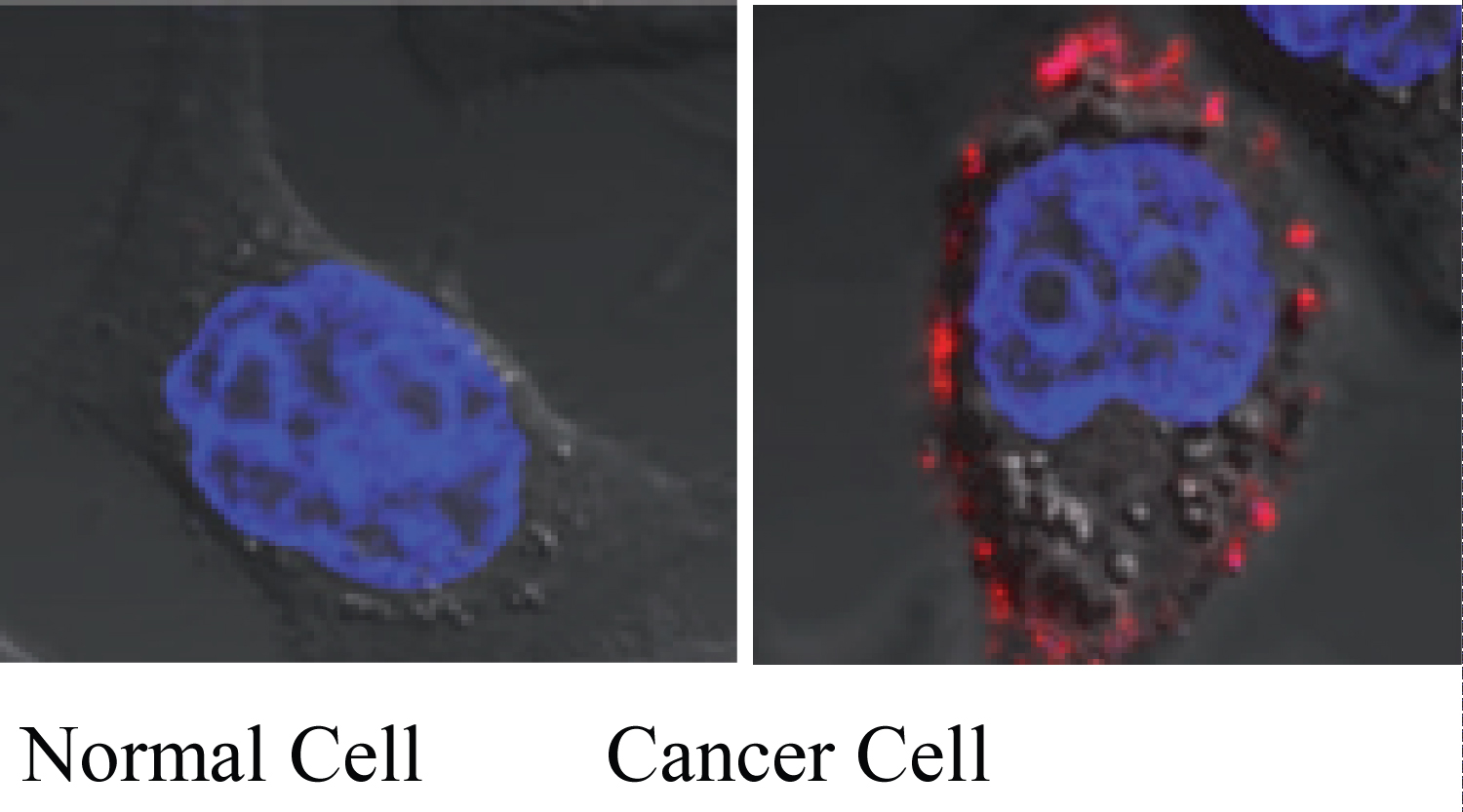 Figure 2: Identification of specific rhamnose binding protein (RBP) receptors on cancer cells by a fluorescence rhamnose probe. Normal non-cancer cells do not possess the RBP receptors. The red images indicate the binding of rhamnose conjugates (solamargine) to RBP receptors.