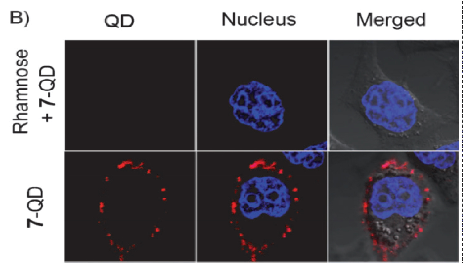 Figure 3: Confocal microscopic view of rhamnose-QD probe (representing solamargine) localized on the cell surface of human squamous cell carcinoma (KB) cells. The binding of the probe was blocked by rhamnose. Confocal microscope image of KB cells labelled by probe (red) and Hoechst stain (blue).