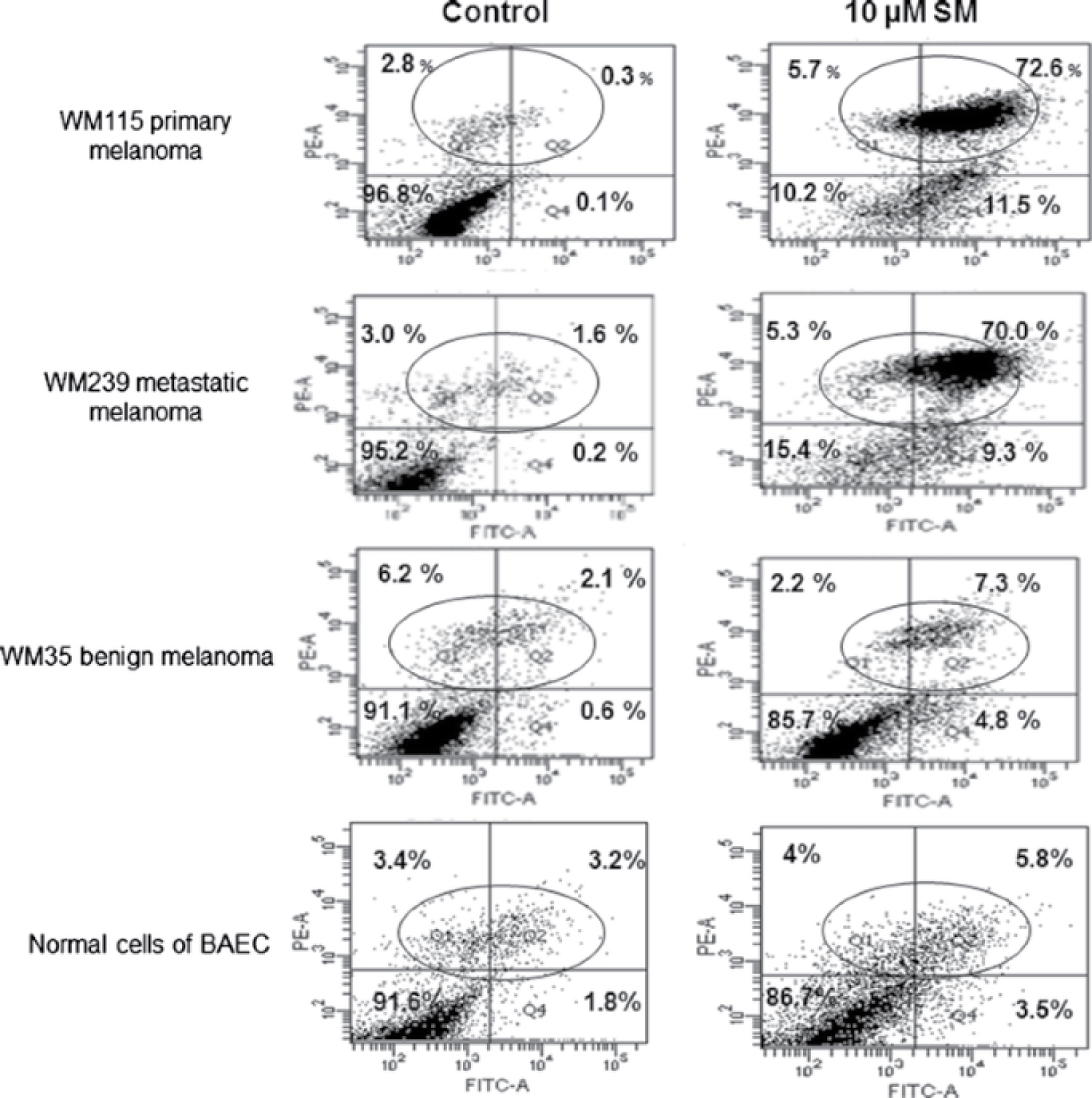 Figure 6: Flow cytometry analysis showed that solamargine (SM) increased cell death tenfold more in malignant to benign cells. 10 μM Solamargine treatment for 2 h selectively caused massive cellular death of WM115 primary and WM239 metastatic melanoma cells, which were at least tenfold, more than that detected in benign WM35 and/or in bovine aortic endothelial cells (BAEC) normal cells.