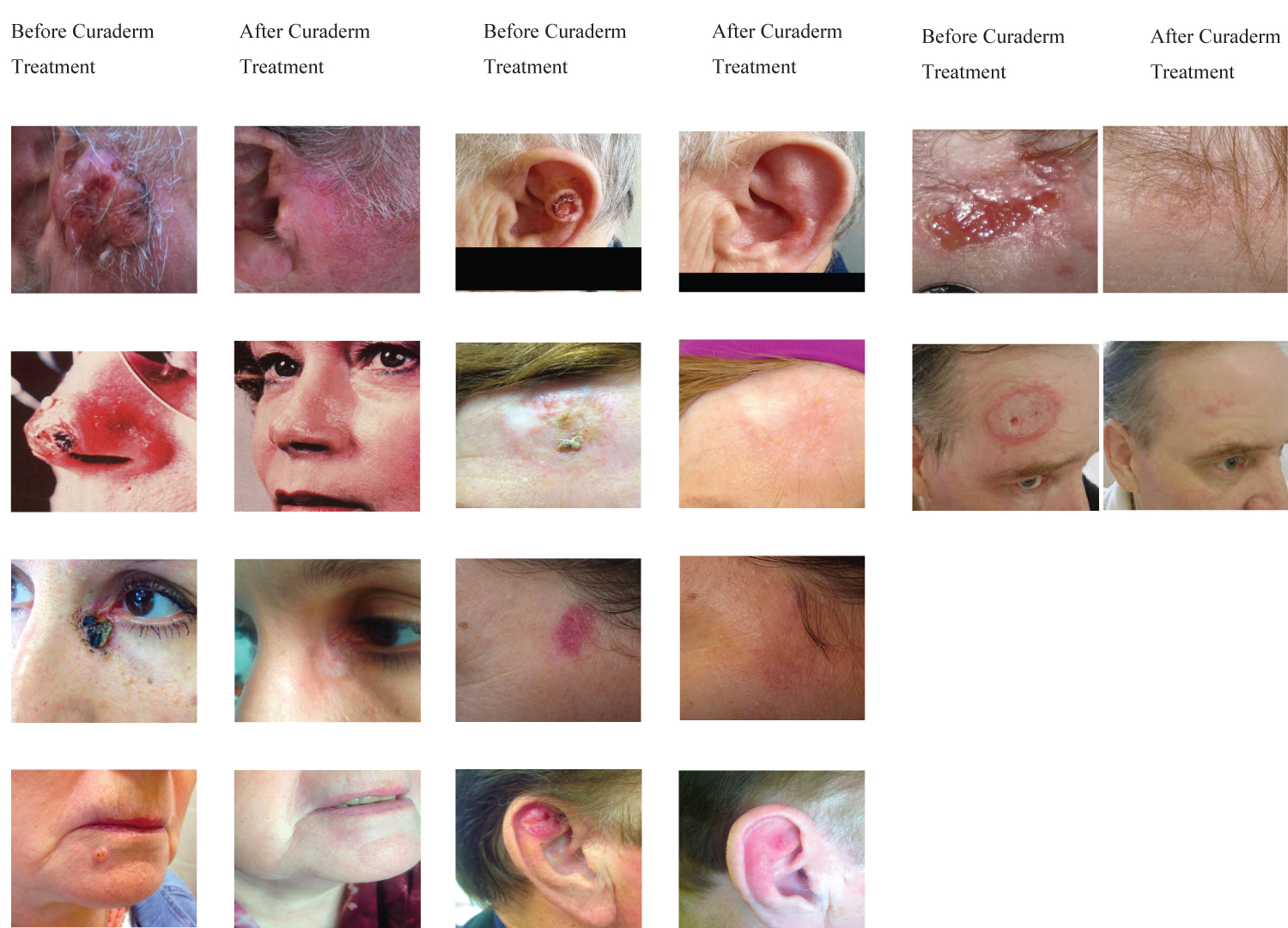 Figure 7: Examples of poor treatment prognoses of BCC lesions due to size, type, depth, previous failure by other treatment modalities and location (column, Before Curaderm Treatment) and the impressive cosmetic outcomes of Curaderm therapy by simple topical application (column, After Curaderm Treatment). Curaderm-treated lesions did not recur for at least 5 years follow-up.
