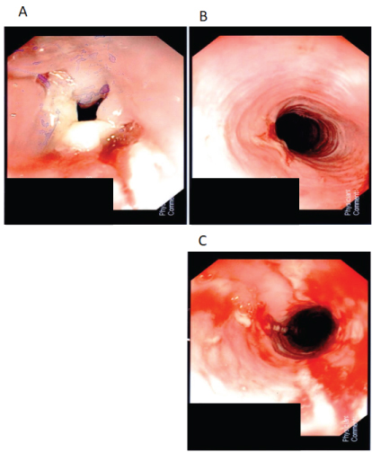 Figure 1: A) Esophageal ulceration and stricture pre-dilatation; B) Esophagus distal to the stricture; C) Esophageal stricture post-dilatation.