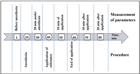The parameters of the cardiovascular system were measured in animals while being awake (before anesthesia), under anesthesia and when recovering from anesthesia. Parameters were measured by a non-invasive method using the Coda system ("Kent Scientific", USA) according to the order shown in Figure 1. When measuring parameters, animals were in plastic transparent cones with tails out. Two cuffs were placed on the tail. To reduce the emotional component, as well as to reduce motor activity when measuring pressure and other parameters without anesthesia, animals were preliminarily trained by being planted into transparent cones for 2 days for 15 minutes. During the experiment, the following parameters were measured that characterize the work of the cardiovascular system: blood pressure (systolic, diastolic and mean), heart rate, blood flow and tail blood volume.