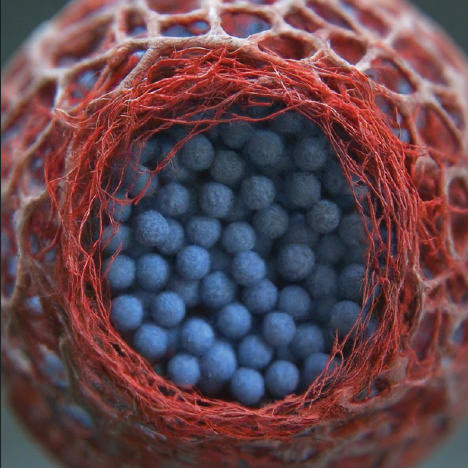 Figure 2: Computer generated representations of Risperdal Consta, microsphere of poly(lactic acid)-poly(ethylene glycol)-poly(lactic acid)-a structure similar to that of biodegradable surgical suture (red) containing risperidone (blue): Since the polymeric shell needs enzymatic degradation of 3-weeks, oral supplementation is necessary for first 3-weeks for Consta.
