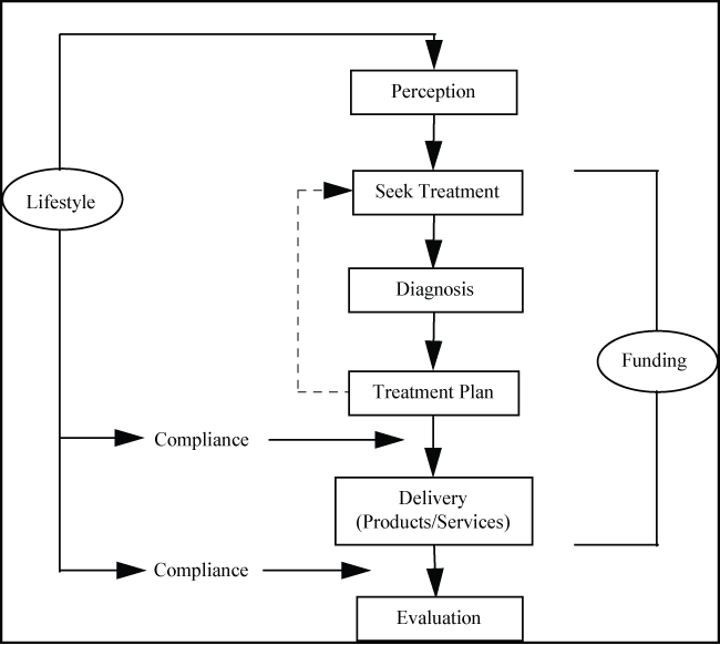 It was found that the perception of a health-related 'need' is the starting point in this model. The patient is the primary decision maker at this point, but others in the patient-payer clusters are significant influencers, such as family, friends, and co-workers. The patient perceives a problem exists due to: signs of pain or discomfort; other visual signs; change in function; suggestion, such as through mass media, or increased awareness due to education (from clinician, internet, reading, advertising, etc.).