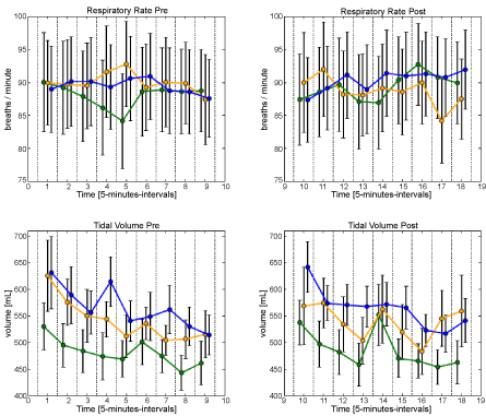 Graphical presentation of tidal volume and respiratory rate (mean values and Standard Error of the Mean (SEM)) during baseline measurement and 45 minutes after treatment with fenoterol, shown as average of 5-min intervals. Fenoterol: Green, Oxitropium: Yellow, Placebo: Blue. Data points have been slightly shifted against each other with regard to the time axis in order to increase their visibility. View Figure 1