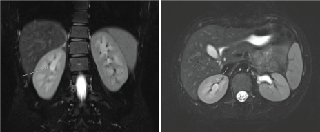 Figure 3: MR Urogram showing prominent bilateral upper pole medullary pyramids consistent with papillary hypertrophy. Case 1-EC. View Figure 3