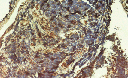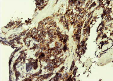 Figure 2C: CD56 positivity in tumor cells (100X).