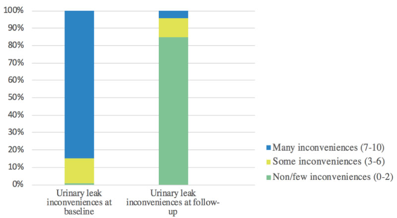 At baseline, 84.7% of the women reported many inconveniences. At follow-up, inconveniences were only reported by 4.1%. At follow-up, 84.9% reported non/few inconveniences, while only 0.9% of the women reported non/few inconveniences before surgery.
