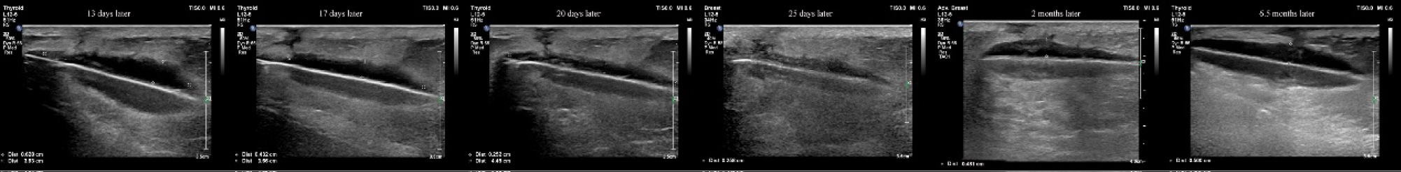 Figure 3: We used ultrasound to monitor the liquid at the stimulator position and measure the distance of the liquid area. The depth of the liquid dark area was reduced from 0.628 cm to 0.258 cm within 2 weeks.