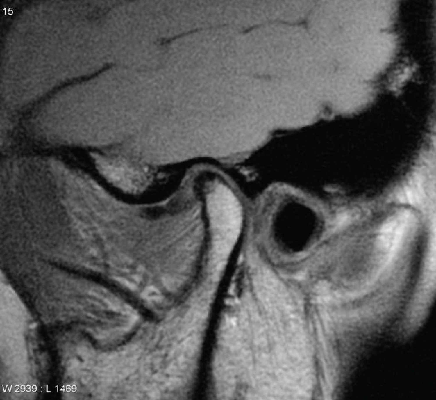 Figure 4: (Image from radiopaedia.org- used with permission). Normally, the disc resides as a cushion between the fossa in the skull and the head of the mandible, called the condyle. The image shows an anteriorly dislocated disc without recapture on mouth opening. The best way to determine if the disc displaces with movement is to use a Cine MRI. This is a MRI movie of the TMJ as the patient opens and shuts his or her jaw. The patient is performing the very activity (opening and shutting the jaw) which produces symptoms, so the physician has the opportunity to see what actually happens when the patient opens and shuts his or her jaw. View Figure 4