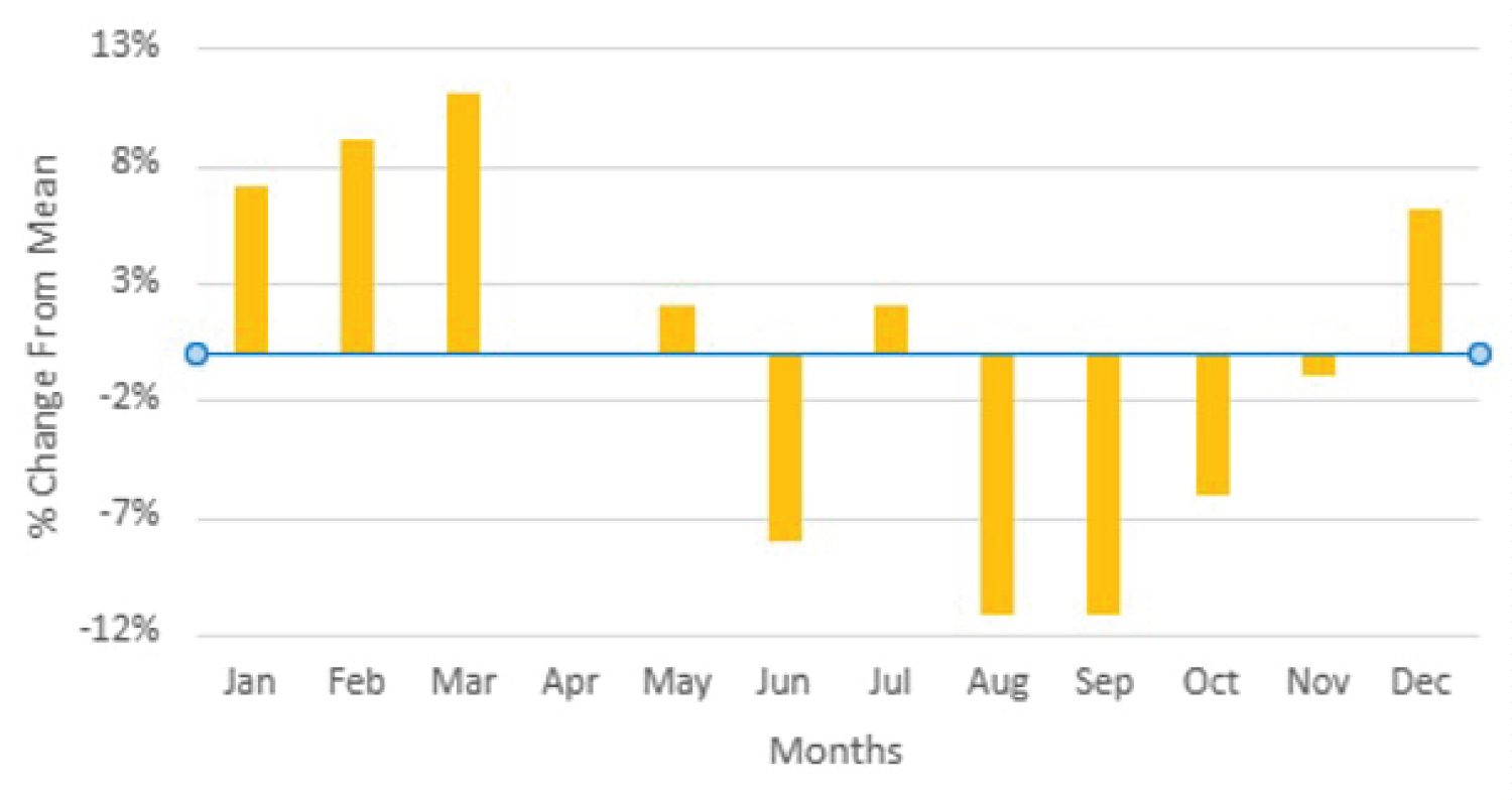 Linear regression analysis was performed to evaluate whether there was a significant association between GT search volumes and PubMed publication data. R-squared values and P values (alpha < 0.05 for significance) were recorded. Potential temporal trends were analyzed by averaging the deviation in interest for each month against the respective annual mean interest for each search term that returned a statistically significant positive correlation to PubMed publication data. All statistical analyses and construction of figures and tables were performed in Microsoft Excel Version 15.21.1.