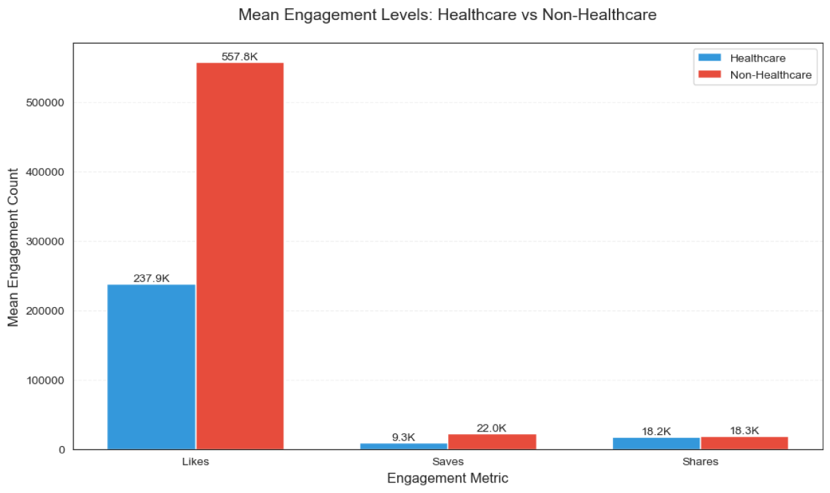 The comparison between Healthcare and Non-Healthcare content revealed notable but statistically non-significant differences in engagement metrics. Non-Healthcare content showed substantially higher mean Likes (567,800 vs. 237,900; p = 0.059) and Saves (22,000 vs. 9,300; p = 0.157), though these differences did not reach conventional significance thresholds. Shares demonstrated near-identical mean values between sectors (18,300 Non-Healthcare vs. 18,200 Healthcare; p = 0.992), indicating no meaningful difference in sharing behavior. While the pattern suggests Non-Healthcare content may generate higher engagement, the p-values all exceed 0.05, meaning we cannot confidently reject the null hypothesis of equal engagement levels between sectors.