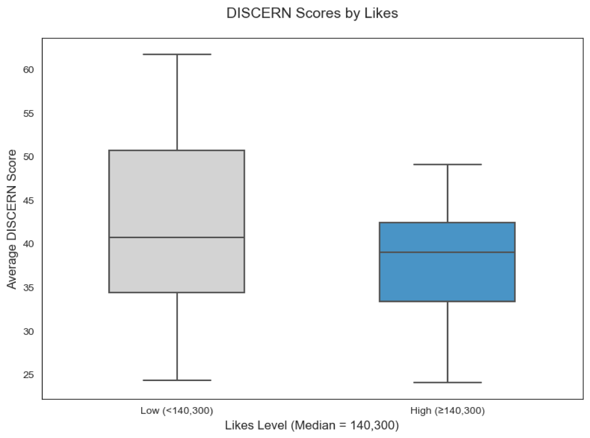 Boxplots illustrate the distribution of average DISCERN scores for videos stratified by number of likes, divided at the median value of 140,300. Boxes represent the interquartile range (IQR), horizontal lines indicate the median, and whiskers denote the full range of observed values.