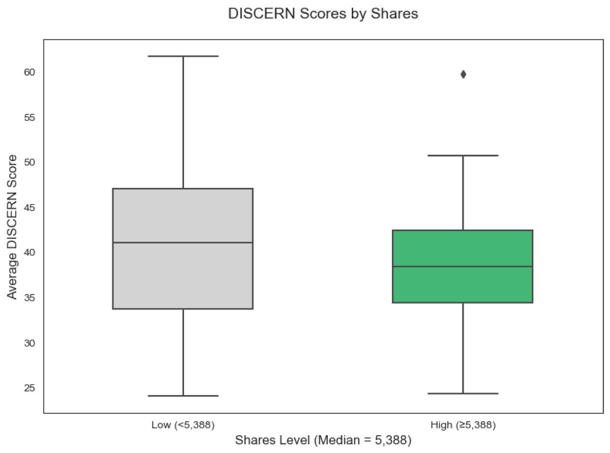 Boxplots present the distribution of average DISCERN scores for videos categorized by share count, split at the median value of 5,388. Boxes denote the interquartile range (IQR), horizontal lines represent the median, and whiskers indicate the observed range of values.