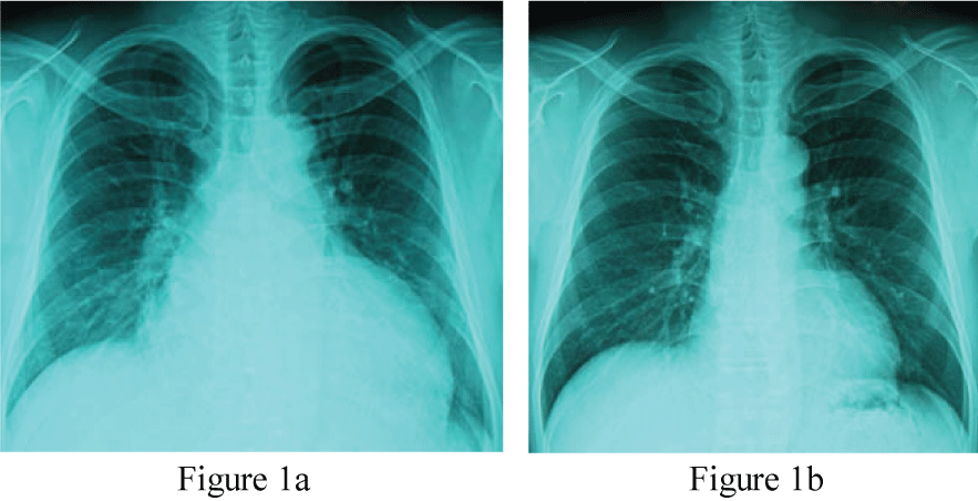 Figure 1: Chest X-ray taken immediately after the emergency room care (Figure 1a, CTR 65%) and that taken 6 months after the therapy (Figure 1b, CTR 47%).