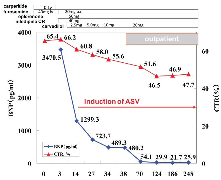 Figure 3: Clinical course and therapeutic interventions during hospitalization and the outpatient are shown. BNP: B-type natriuretic peptide (pg/ml), CTR: cardio thoracic ratio (%), ASV: Adaptive Servo Ventilation.
