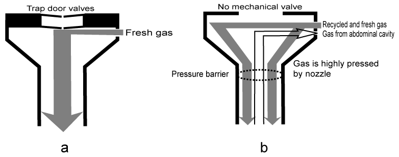 a) Conventional trocar: Insufflation gas fills the abdominal cavity, which is sealed by mechanical trap door valves. Gas is suctioned through the insufflation cock or through other trocars' cocks; b) Valveless trocar: A trocar without mechanical valves has a nozzle structure. This structure causes downflow of the insufflation gas, which provides sufficient pressure to seal the abdominal cavity without the use of mechanical valves. Gas is continuously circulated in the abdominal cavity.