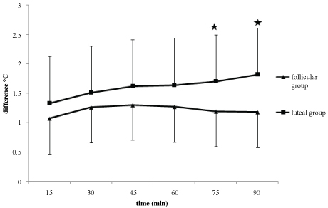 Figure 2: The skin temperature differences from baseline are shown in both groups. *P < 0.005 compared with Follicular Group.