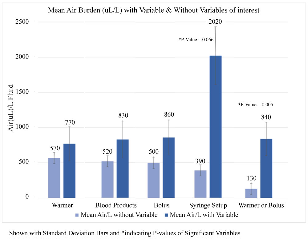 The data identifies specific clinical manipulations that generate air increasing the patient's air burden; cases with fluid warmers, bolus injections of medication and fluid, syringe IV setups, and administration of blood products. Specifically, when either a warmer or bolus is used, there is a high correlation of air introduced (P = < 0.001) with a probability of 79% of any volume of air entering IV tubing. The use of warmer and bolus administration in combination resulting difference in means was significant with 95% confidence.