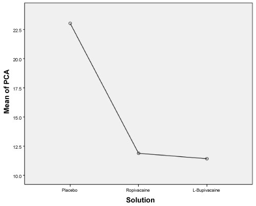 There was a statistical difference between the placebo and local anaesthetic (LA) group in terms of use of PCA morphine (PCAM). P = 0 (Table 2). There was a significantly higher usage of morphine with placebo group (23.03 mg) to attain the required comfortable state than Ropivacaine (11.89 mg) and Levo-bupivacaine group (11.42 mg) (Figure 1 and Table 3).