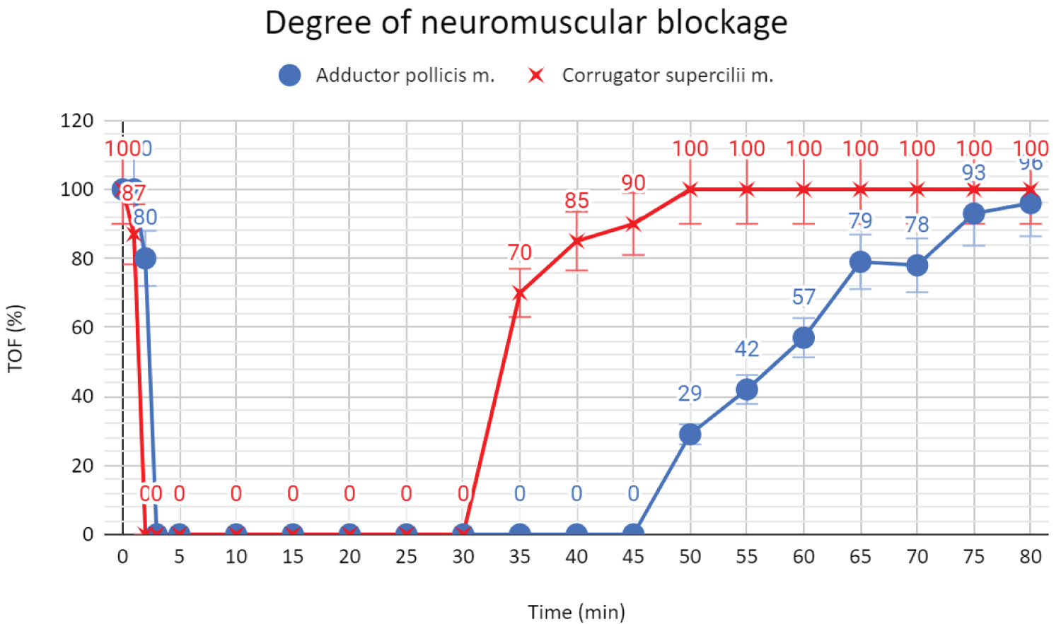 The next day the patient arrived at the operating room. The patient was also in a clinical trial comparing the TOF Scans, therefore we measured the neuromuscular transmission with this device through the electrodes placed above the ulnar nerve (the adductor pollicis muscle-TOFapb + standard method) and on the forehead (the corrugator supercilii muscle - TOFcsm). After securing the perioperative monitoring: EKG, NIBP, SaO2, ventilation parameters, an epidural blockade L3-L4 was performed with 10ml Bupivacaine Hydrochloricum 0.5%, 6ml Fentanyl (0.1mg/2ml) and 34ml NaCl at 6 milliliters per hour. Dexamethasone 8mg as an antiemetic, 0.1 mg fentanyl, 150mg propofol, and 18mg mivacurium were used for induction. The patient was intubated after 135 seconds with a 7.0 tube using a bougie guide (Cormack grade 2). Anaesthesia was maintained with a mixture of sevoflurane (MAC 0.9) and air with FiO2= 0.5, FGF = 1 l / min. Ventilation was carried out in SIMV-PC mode with PEEP = 5mbar, without pressure support. An intravenous infusion of 1000ml of Optilyte was administered. The neuromuscular transmission was measured every 15 seconds during the first 10 minutes and then every 5 minutes till extubation. After 30 minutes, TOFapb-Scan still showed 0%. TOFapb > 90% was obtained only after 75 minutes after the administration of a single dose of mivacurium (Figure 1). The patient was extubated without any complications after 80 minutes with TOFapb = 96% and received 10 points in Aldrete score.